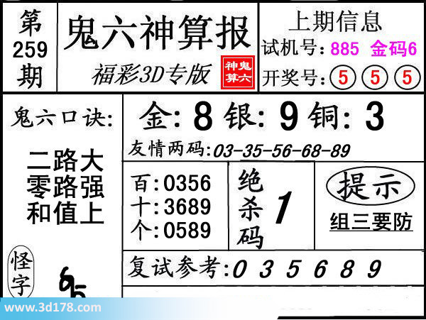 3d鬼六神算报第259期为您推荐鬼六口诀