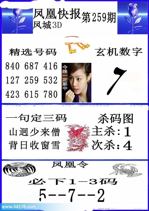玄机数字:7精选号码:840 687 416 127 259 532 423 615 780一句定三码:山迥少来僧,背日收窗雪杀码图:主杀:1 次杀:4凤凰令:必下1-3码,5-7-2该凤凰快报图库由3D之家3D图库频道原创,仅供彩民参考,温馨提供。
