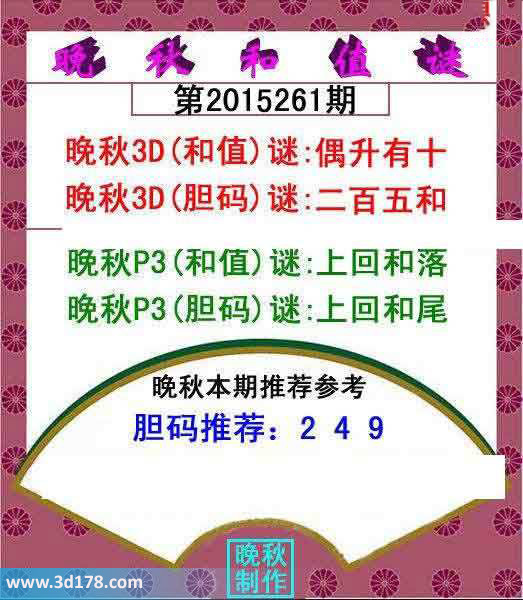 3d第2015261红五晚秋推荐详情:晚秋3D(和值)谜:偶升有十晚秋3D(胆码)谜:二百五和晚秋P3(和值)谜:上回和落晚秋P3(胆码)谜:上回和尾胆码推荐:249