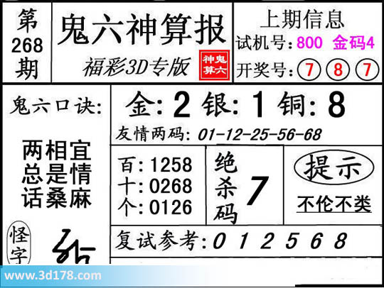 3d鬼六神算报第268期推荐:复式参考012568