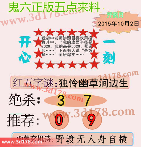 彩3d鬼六图库第15268期鬼六正版五点来料图:第268期3d鬼六五点来料图详解:字谜:独怜幽草涧边生绝杀:37两胆码推荐:09内幕玄机诗:野渡无人舟自横该鬼六图库由福彩3D之家3D图库频道原创,仅供彩民参考,温馨提供。