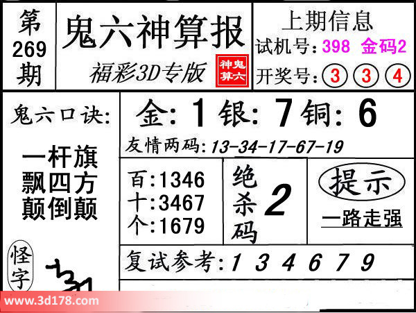 3d鬼六神算报第269期为您推荐鬼六口诀: