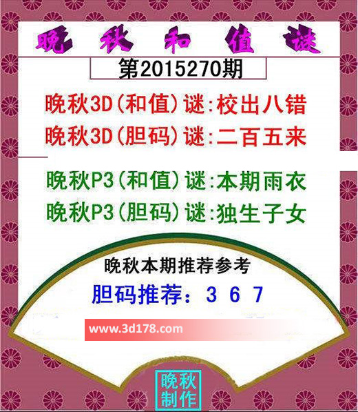 第15270期福彩3d红五图为您推荐和值以及组选: