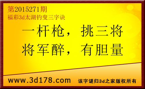 第2015271期3d太湖图库解太湖钓叟三字诀:福彩3d第271期太湖图库解析:一杆枪:有一杆枪,解1看8; 挑三将:挑战三个将士,明3有9; 将军醉:将军都醉了,解6看1; 有胆量:非常的有胆量,防9解6;五码复式:13689(含组三) 精选10注:136 138 139 168 169 189 368 369 389 6893d太湖图库由3D之家3D图库频道原创,仅供彩民参考,温馨提供。