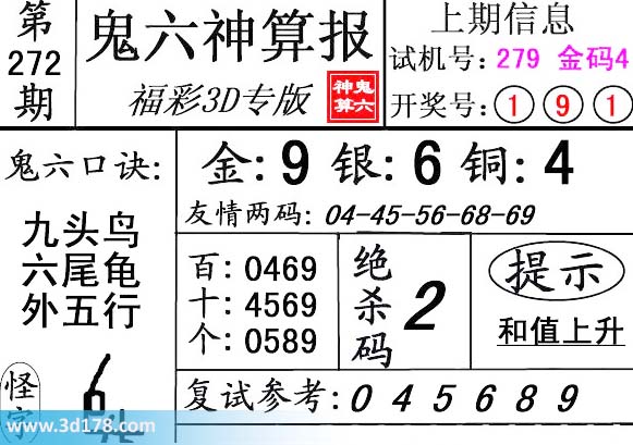3d鬼六神算报第272期为您推荐鬼六口诀: