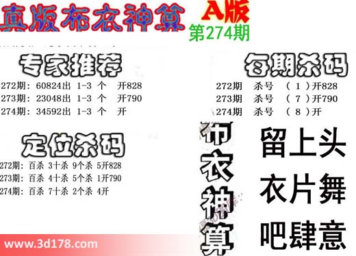 专家推荐:274期:34592 出 1-3 个 定位杀码:274期:百位杀7 十位杀2 个位杀4每期杀码:274期杀一码8布衣神算:留上头,衣片舞,吧肆意