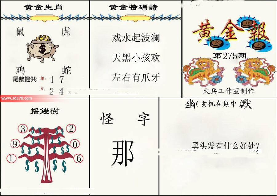 摇钱树推荐号码:391 206怪字:踩幽默(玄机在期中):黑头发有什么好处?