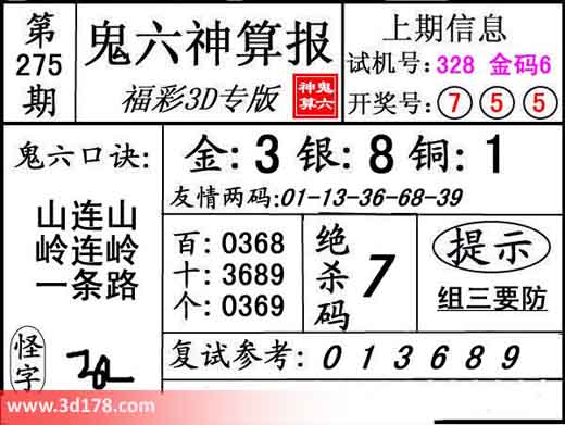 3d之家3d鬼六神算报第275期分析如下:鬼六口诀:山连山,岭连岭,一条路友情两码:01-13-36-68-39复式参考:013689三码推荐金胆:3,银胆:8,铜胆:1定位复式:013689百位:0368十位:3689个位:0369