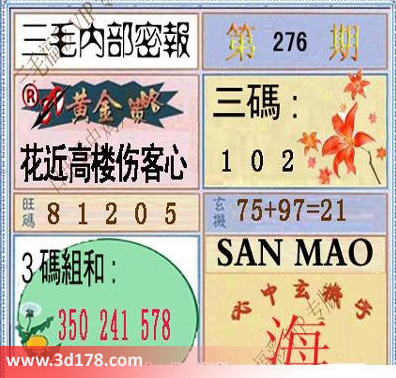 3d之家三毛图库第276期三毛内部密报图详解:黄金策略:花近高楼伤客心三码:102旺码:812053码组合:350 241 578玄机:75+97=21必中玄机字:海该三毛内部密报图库由3D之家3D图库频道原创,仅供彩民参考,温馨提醒。