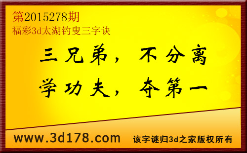 福彩3d第278期太湖图库解析:三兄弟:三个亲兄弟,感情很好;明码解3不分离:从小到大没有分离过;不理解为没有;解:0学功夫:从小一起学习武功;学武功要很久,理解为9;解:9夺第一:三个人都想争夺第一名;第一理解为1;解明码1