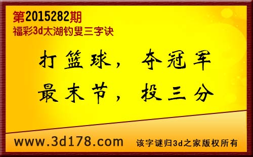 3d第2015282期太湖图库解字谜:福彩3d第2015282期太湖图库:打篮球:打一场篮球赛,解1有0;夺冠军:拿下第一名,看1有6;最末节:最后一节的比赛,解4防9;投三分:投了一个三分球,看3有7;五码复式:01467(含组三) 组选10注:016 679 346 347 167 179 099 469 046 4463d太湖图库由3D之家3D图库频道原创,仅供彩民参考,温馨提供。