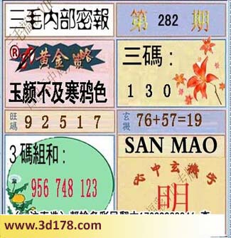 福彩3d第282期三毛内部密报综合推荐如下:3d之家三毛图库第282期三毛内部密报图详解:黄金策略:玉颜不及寒鸦色三码:130旺码:925173码组合:956 748 123玄机:76+57=19必中玄机字:明该三毛内部密报图库由3D之家3D图库频道原创,仅供彩民参考,温馨提醒。
