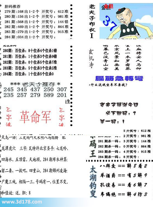 3d第2015284期老夫子布衣预测今日必下胆码图:3d之家第15284期老夫子布衣图库详解:284期:034 出1-2个 开奖号:284期:百位杀1 十位杀5 个位杀0老夫子精选推荐:245 345 437 250 307235 257 279 589 201老夫子预测今日必下胆3,杀一码1脑筋急转弯:为什么流氓坐车不要钱?该布衣图库由福彩3D之家3D图库频道原创,仅供彩民参考,温馨提供。