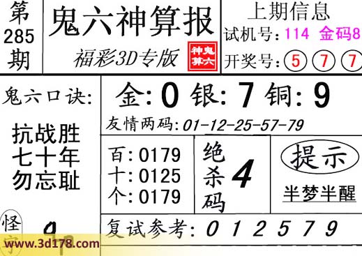 3d鬼六神算报第285期为您推荐鬼六口诀: