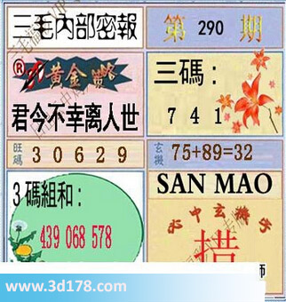 福彩3d第290期三毛内部密报综合推荐如下:3d之家三毛图库第290期三毛内部密报图详解:黄金策略:君今不幸离人世三码:741旺码:306293码组合:439 068 578玄机:75+89=32必中玄机字:措该三毛内部密报图库由3D之家3D图库频道原创,仅供彩民参考,温馨提醒。