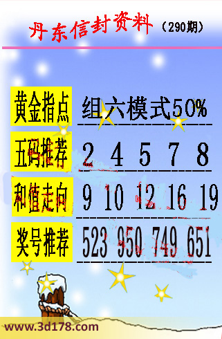 福彩3d第290期丹东信封图如下所示:第2015290期丹东信封资料推荐:黄金指点:组六模式50% 五码推荐:24578和值走向:9 10 12 16 19奖号推荐:523 950 749 651该丹东图库由3D之家3D图库频道原创,仅供彩民参考,温馨提供。