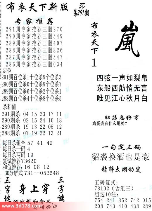 第2015291期福彩3d布衣天下新版:本期3d之家布衣图库3d布衣天下新版详解:定位杀号推荐:百位杀1 十位杀9 个位杀3杀和值推荐:04 15 23 17 11每日杀组合: 57 41 49每日杀一码:4每日杀两码:19复式推荐:73620和值推荐:16 08 123d分解式:731—0526483d布衣图库玄机诗:四弦一声如裂帛,东船西舫悄无言,唯见江心秋月白。该布衣图库由福彩3D之家3D图库频道原创,仅供彩民参考,温馨提供。