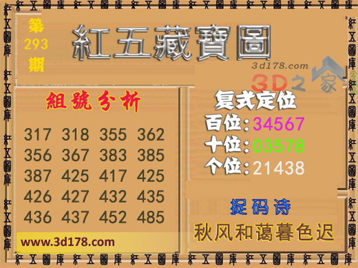 3d之家第2015293期红五图库之红五藏宝图:3d之家3d红五藏宝图第2015293期为您推荐复式定位、捉码诗以及组号分析:复式定位:百位:34567十位:03578个位:21438捉码诗:秋风和蔼暮色迟组号分析: