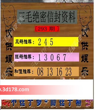 3d之家第2015293期三毛绝密信封资料图:福彩3d第293期三毛绝密信封资料图详解:三码推荐:245旺码推荐:01367和值推荐:08 13 16 23三毛图库由3D之家3D图库频道原创,仅供彩民参考,温馨提供。