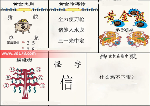 福彩3d第2015293期3d黄金报为您推荐黄金特码:3d之家第2015293期3d黄金报详细内容如下:黄金特码诗:全力使刀枪,猪笼入水龙,三一来中定黄金生肖:猪蛇鸡龙尾数推荐:单:35 双:28摇钱树推荐号码:369 784怪字:信幽默(玄机在期中):什么鸡不下蛋?黄金报图由3D之家3D图库频道原创,仅供彩民参考,温馨提供。