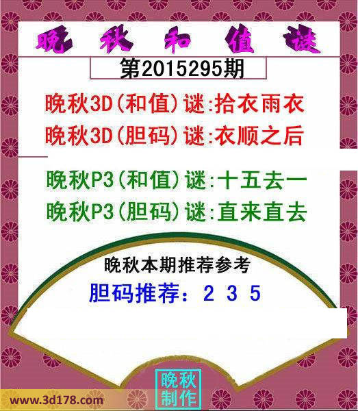 晚秋3D(和值)谜:拾衣雨衣晚秋3D(胆码)谜:衣顺之后晚秋P3(和值)谜:十五去一晚秋P3(胆码)谜:直来直去胆码推荐:235