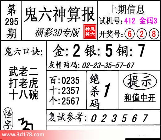 3d鬼六神算报第295期为您推荐鬼六口诀: