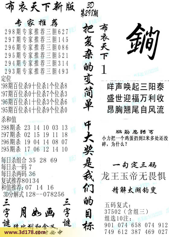 本期3d之家布衣图库3d布衣天下新版详解:定位杀号推荐:百位杀9 十位杀1 个位杀8杀和值推荐:23 14 10 03 13每日杀组合: 35 28 69每日杀一码:7每日杀两码:36复式推荐:80134和值推荐:07 14 163d分解式:128—0782563d布衣图库玄机诗:咩声唤起三阳泰,盛世迎福万利收,昂胸翘尾自风流。该布衣图库由福彩3D之家3D图库频道原创,仅供彩民参考,温馨提供。