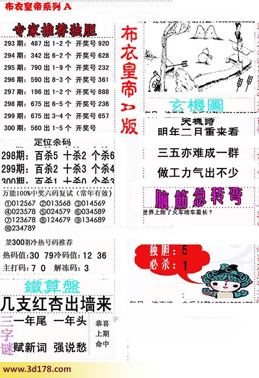 福彩3d第2015300期布衣天皇帝A版布衣专家独家推荐:3d之家布衣天下皇帝第300期详解:专家推荐独胆:300期:560 出1-5个 开奖号定位杀码:百位杀1 十位杀0 个位杀3第300期冷热号码推荐:热码值:30 79冷码值:12 36主打码:7 0解冻码:33d布衣皇帝玄机诗:明年二月重来看,三五亦难成一群,做工力气出不少。铁算盘:几支红杏出墙来三字谜:一年尾 一年头赋新词 强说愁该布衣图库由福彩3D之家3D图库频道原创,仅供彩民参考,温馨提供。