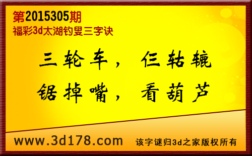 第15305太湖字谜解太湖钓叟三字诀:福彩3d第2015305太湖图库解析:三轮车:骑三轮车,解3防7;仨轱辘:三轮车有三个轱辘,看3有0;锯掉嘴:把嘴巴锯掉,解0有8;看葫芦:再来看看葫芦的样子,看8解9;五码复式:03789(含组三) 精选10注:037 378 389 789 089 023 347 458 569 3383d太湖图库由3D之家3D图库频道原创,仅供彩民参考,温馨提供。