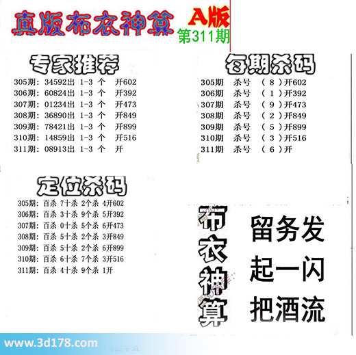 3d布衣神算第311期定位杀码:3d之家布衣图库之布衣神算图第2015311期详解:专家推荐:311期:08913出 1-3 个 定位杀码:311期:百位杀 4 十位杀 9 个位杀 1每期杀码:杀一码6布衣神算:留务发 起一闪 把酒流该布衣图库由福彩3D之家3D图库频道原创,仅供彩民参考,温馨提供。