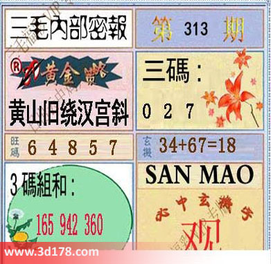 3d之家三毛图库第311期三毛内部密报图详解: 黄金策略:黄山旧绕汉宫斜三码:027旺码:648573码组合:165 942 360玄机:34+67=18必中玄机字:观 该三毛内部密报图库由3D之家3D图库频道原创,仅供彩民参考,温馨提醒。