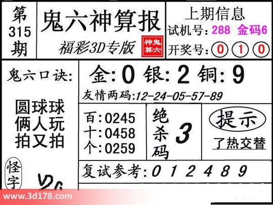 3d之家3d鬼六神算报第315期分析如下: