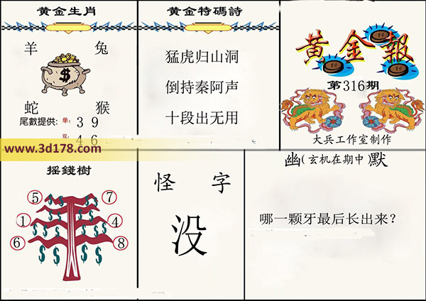 黄金特码诗:猛虎归山洞,倒持秦阿声,十段出无用黄金生肖:猪蛇鸡龙尾数推荐:单:39 双:46摇钱树:516 748怪字:没幽默(玄机在期中):哪一颗牙最后长出来?