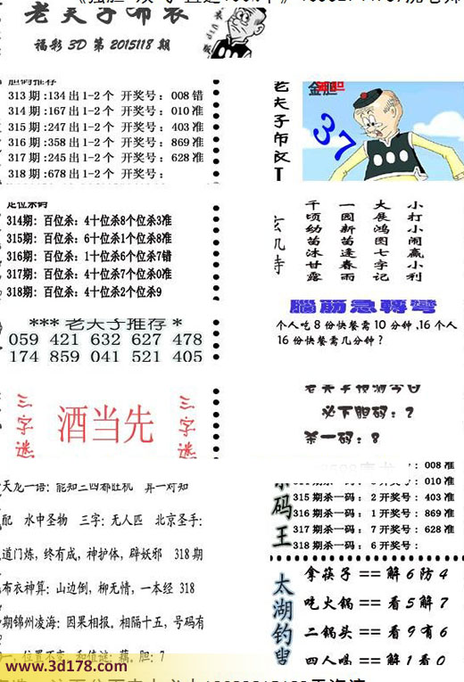 3d第2015318期老夫子布衣预测今日必下胆码图:3d之家第15318期老夫子布衣图库详解:318期:678 出1-2个 开奖号:318期:百位杀 4 十位杀 2 个位杀 9老夫子精选推荐:059 421 632 627 478174 859 041 521 405老夫子预测今日必下胆7,杀一码8脑筋急转弯:1个人吃8份快餐需10分钟,16个人16份快餐需几分钟?该布衣图库由福彩3D之家3D图库频道原创,仅供彩民参考,温馨提供。