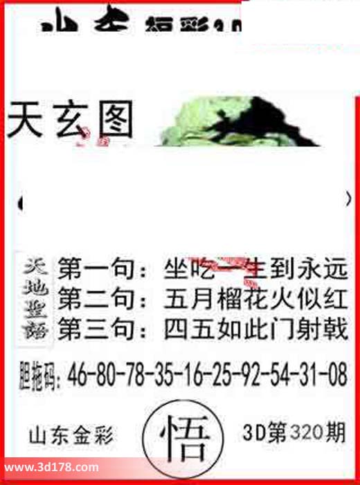 福彩3D第2015320期山东天玄图之天地聖语:3d第15320期山东天玄图分析详情:天地圣语:第一句:坐吃一生到永远第二句:五月榴花火似红第三句:四五如此门射戟胆拖码:46-80-78-35-16-25-92-54-31-08该丹东图库由3D之家3D图库频道原创,仅供彩民参考,温馨提供。