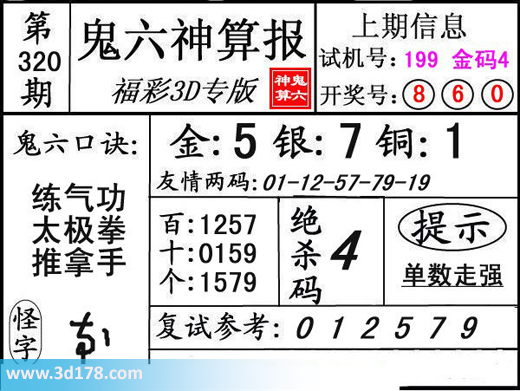 3d第15320期鬼六神算报为您推荐鬼六口诀:3d之家3d鬼六神算报第320期分析如下:鬼六口诀:练气功,太极拳,推拿手友情两码:01-12-47-79-19复式参考:012579三码推荐金胆:5,银胆:7,铜胆:1定位复式:百位:1257十位:0159个位:1579该鬼六图库由3D之家3D图库频道原创,仅供彩民参考,温馨提供。