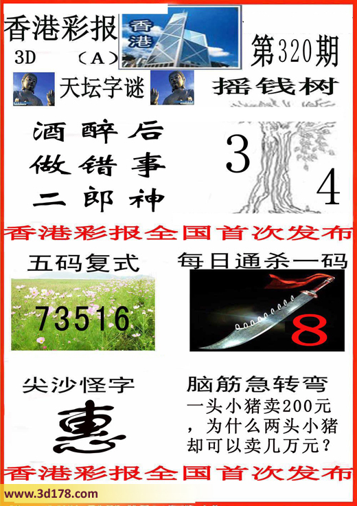 3d之家3d香港彩报第15320期摇钱树:本期3d香港彩报图详情如下:天坛字谜:酒醉后,做错事,二郎神摇钱树:3 4五码复式:73516每日通杀一码:8尖沙怪字:惠脑筋急转筋:一头小猪卖200元,为什么两头小猪可以卖几万元?该香港彩报由福彩3D之家3D图库频道原创,仅供彩民参考,温馨提供。