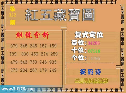 红五藏宝图第15322期3d百位推荐:3d之家3d红五藏宝图第2015322期为您推荐复式定位、捉码诗以及组号分析:复式定位:百位:34285十位:07518个位:14795捉码诗:或从十五北防河组号分析:079 345 245 157 159789 830 459 274 259479 543 759 746 935375 234 267 179 749红五图库由3D之家3D图库频道原创,仅供彩民参考,温馨提供。