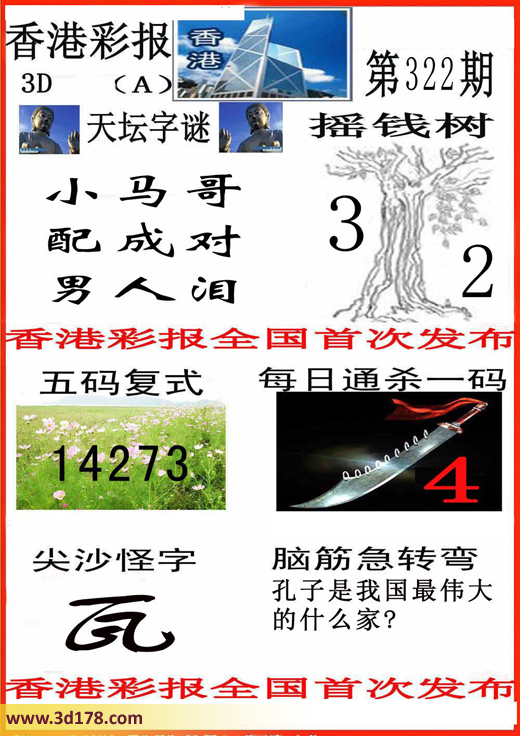 3d之家3d香港彩报第15322期摇钱树:本期3d香港彩报图详情如下:天坛字谜:小马哥,配成对,男人泪摇钱树:23五码复式:14273每日通杀一码:4尖沙怪字:瓦脑筋急转筋:孔子是我国最伟大的什么家?该香港彩报由福彩3D之家3D图库频道原创,仅供彩民参考,温馨提供。