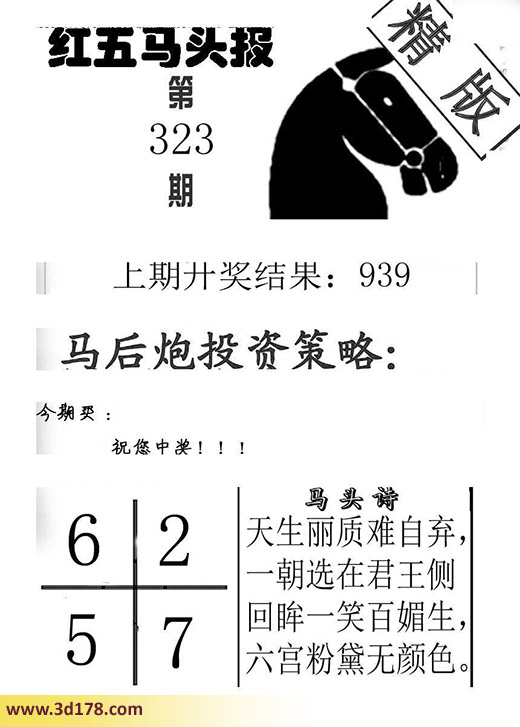 福彩3d第2015323期红五马头报(精版):3d第15323期红五马头报本期马头诗详解:上期开奖号码:939马头诗: 天生丽质难自弃,一朝选在君王侧。回眸一笑百媚生,六宫粉黛无颜色。今期买:6257该红五图库由福彩3D之家3D图库频道原创,仅供彩民参考,温馨提供。