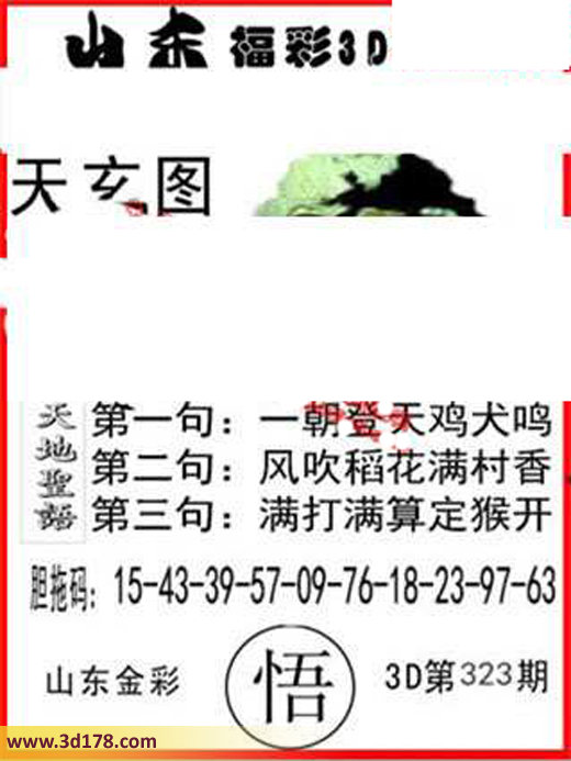 福彩3D第2015323期山东天玄图之天地聖语:3d第15323期山东天玄图分析详情:天地圣语:第一句:一朝登天鸡犬鸣第二句:风吹稻花满村香第三句:满打满算定猴开胆拖码:15-43-39-57-09-76-18-23-97-63该丹东图库由3D之家3D图库频道原创,仅供彩民参考,温馨提供。