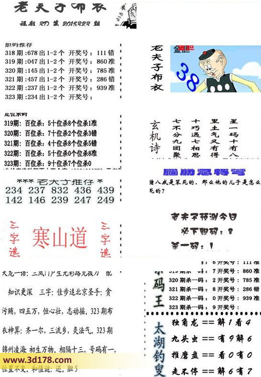 3d第2015323期老夫子布衣预测今日必下胆码图:3d之家第15323期老夫子布衣图库详解:323期:234 出1-2个 开奖号:323期:百位杀 9 十位杀 7 个位杀 0老夫子精选推荐:234 237 832 436 439142 146 239 247 249老夫子预测今日必下胆8,杀一码1脑筋急转弯:猪八戒是笨死的,那么他的儿子是怎么死的?该布衣图库由福彩3D之家3D图库频道原创,仅供彩民参考,温馨提供。
