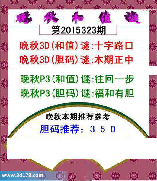 第15323期福彩3d红五图为您推荐和值以及胆码:3d第2015323红五晚秋推荐详情:晚秋3D(和值)谜:十字路口晚秋3D(胆码)谜:本期正中晚秋P3(和值)谜:往回一步晚秋P3(胆码)谜:福和有胆胆码推荐:350该红五图库由3d之家3D图库频道原创,仅供彩民参考,温馨提供。