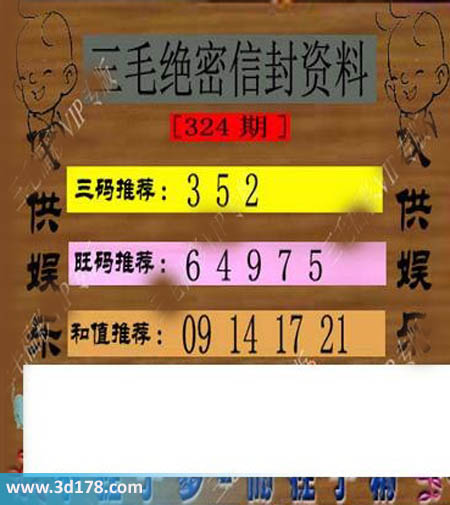 福彩3d第324期三毛绝密信封资料图详解:三码推荐:352旺码推荐:64975和值推荐:09 14 17 21三毛图库由3D之家3D图库频道原创,仅供彩民参考,温馨提供。