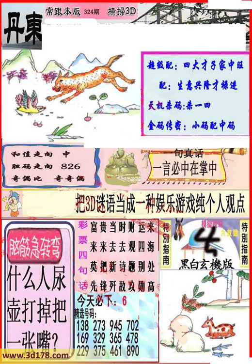 福彩3d丹东图库综合推荐一句真话:3d之家第2015324期丹东快报图详解:超级配:四大才子家中旺配:生意兴隆才禄进天机杀码:杀一四和值走向:中胆码走向:826奇偶比:奇奇偶金码传密:小码配中码精选号码:138 273 945 702 169 329 365 478 229 375 461 890脑筋急转弯:什么人尿壶打掉把一张嘴?该丹东图库由3D之家3D图库频道原创,仅供彩民参考,温馨提供。