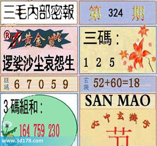 福彩3d第324期三毛内部密报综合推荐如下:3d之家三毛图库第324期三毛内部密报图详解:黄金策略:逻娑沙尘哀怨生三码:125旺码:670593码组合:164 759 230玄机:52+60=18必中玄机字:节该三毛内部密报图库由3D之家3D图库频道原创,仅供彩民参考,温馨提醒。