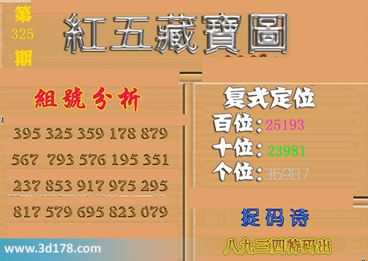 红五藏宝图第15325期3d推荐:3d之家3d红五藏宝图第2015325期为您推荐复式定位、捉码诗以及组号分析:复式定位:百位:25193十位:23981个位:36987捉码诗:八九三四特码出组号分析:395 325 359 178 879567 793 576 195 351237 853 917 975 295817 579 695 823 079红五图库由3D之家3D图库频道原创,仅供彩民参考,温馨提供。