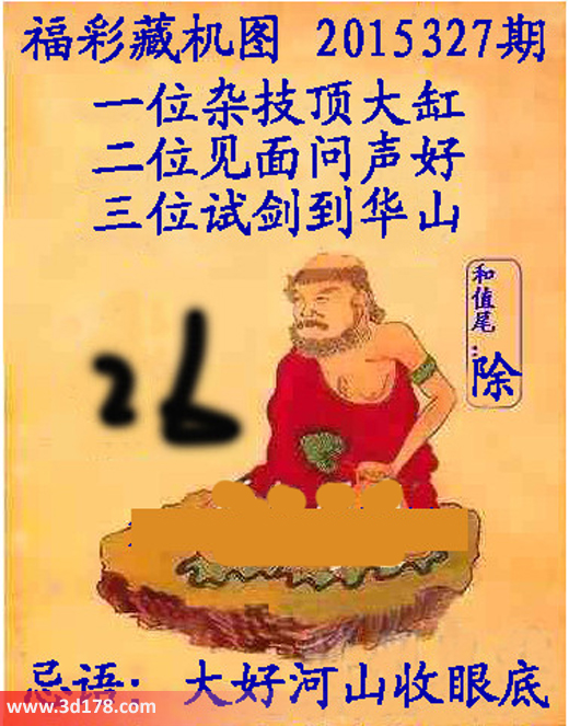 3d之家藏机图第2015327期为您精心推荐:福彩3d第327期正版藏机图详情如下:一位杂技顶大缸二位见面问声好三位试剑到华山和尾:徐忌语:大好河山收眼底3d正版藏机图由3D之家3D图库频道原创,仅供彩民参考,温馨提供。