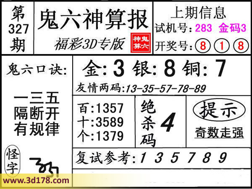 3d第15327期鬼六神算报为您推荐鬼六口诀:3d之家3d鬼六神算报第327期分析如下:鬼六口诀:一三五,隔断开,有规律友情两码:13-35-57-78-89复式参考:135789三码推荐金胆:3,银胆:8,铜胆:7定位复式:百位:1357十位:3589个位:1379该鬼六图库由3D之家3D图库频道原创,仅供彩民参考,温馨提供。