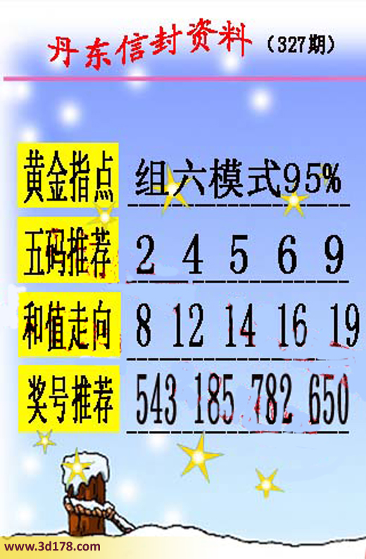 福彩3d第327期丹东信封图如下所示:第2015327期丹东信封资料推荐:黄金指点:组六模式95% 五码推荐:24569和值走向:8 12 14 16 19奖号推荐:543 185 782 650该丹东图库由3D之家3D图库频道原创,仅供彩民参考,温馨提供。